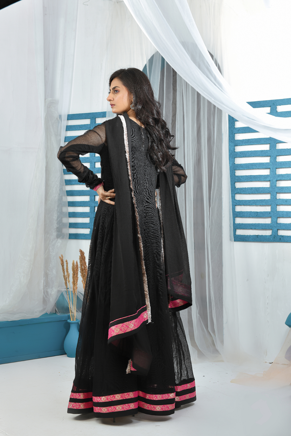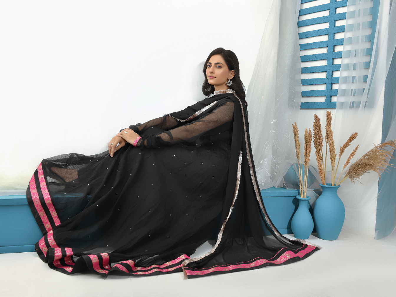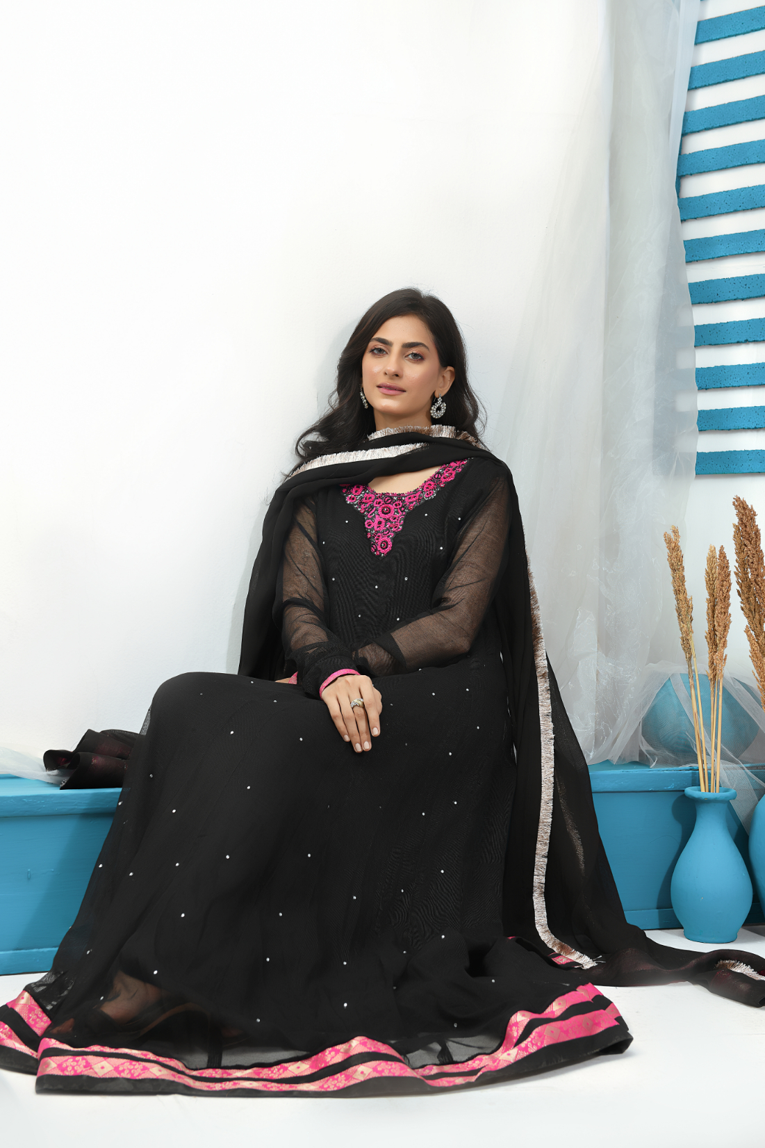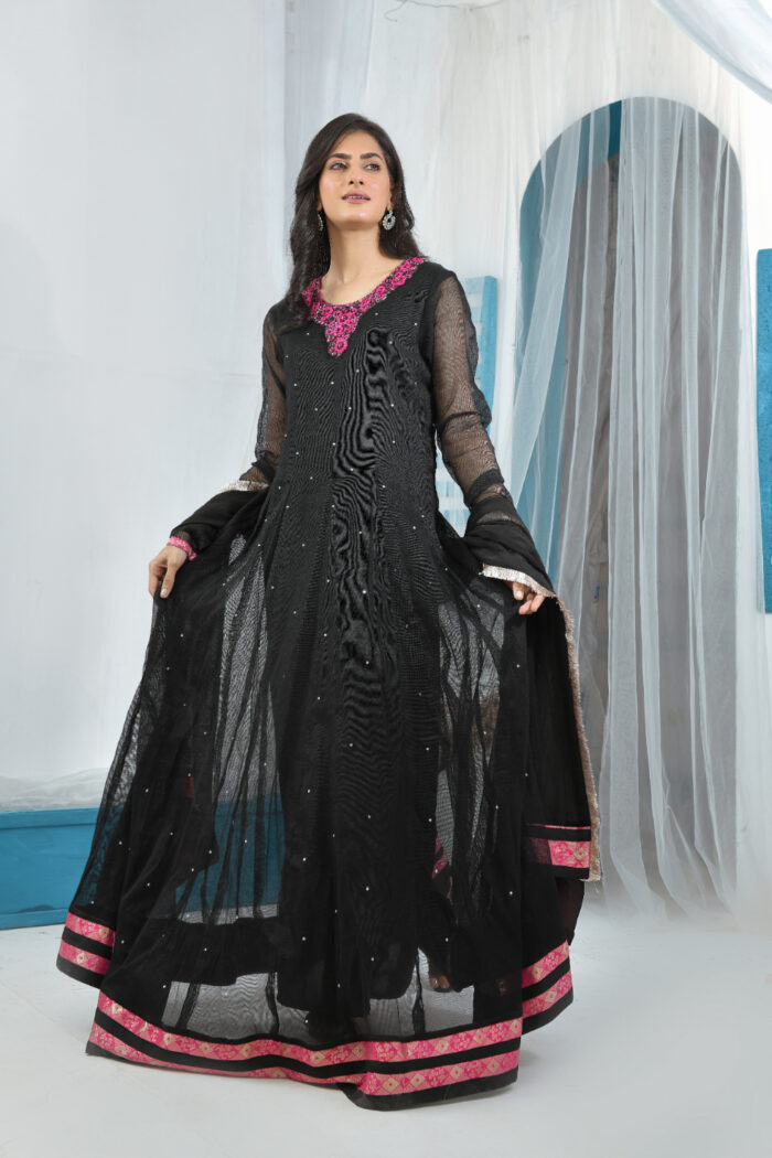 Festive Collection Vol 1 & 2Simply gorgeous in shades of black maxi, vibrant and zesty. Make a style statement in this ‘maxi’ shirt in chiffon stuff. This gorgeous dress maxi style with beautiful color contrast embroidery makes the dress more delicate.‘MS-503’ will surely be a season’s favorite! Glam up the look along with chiffon dupatta and raw silk pants.