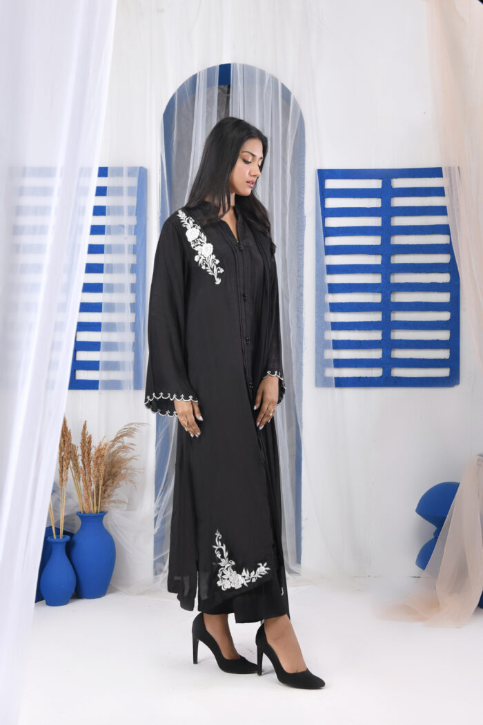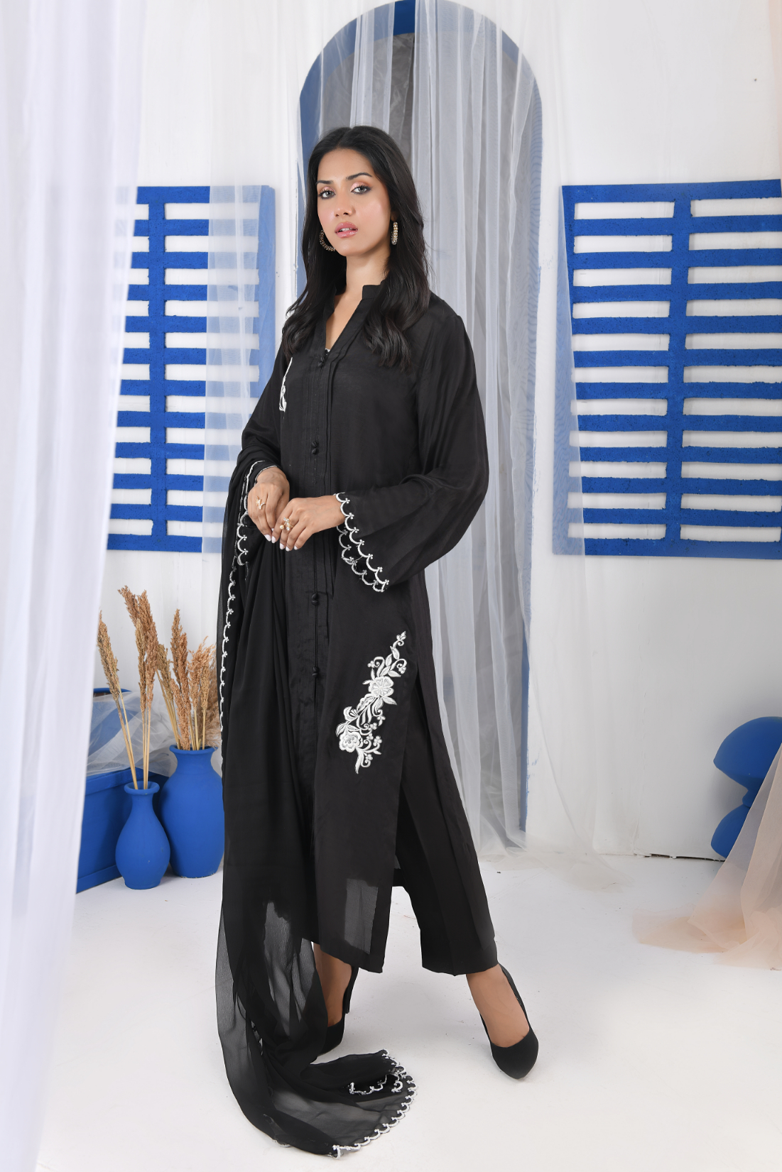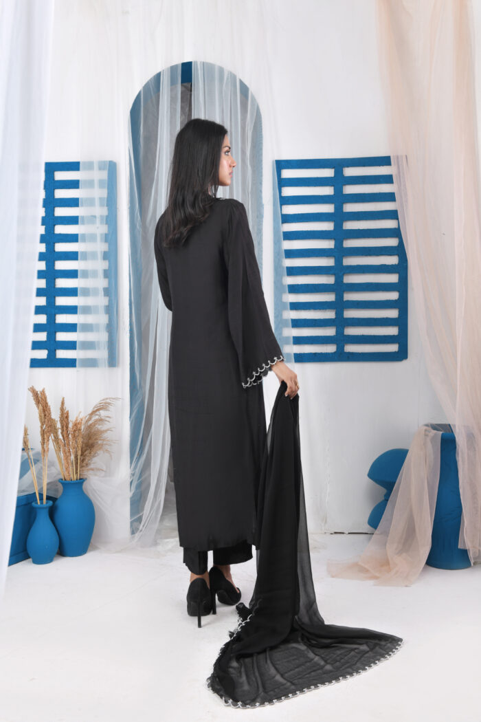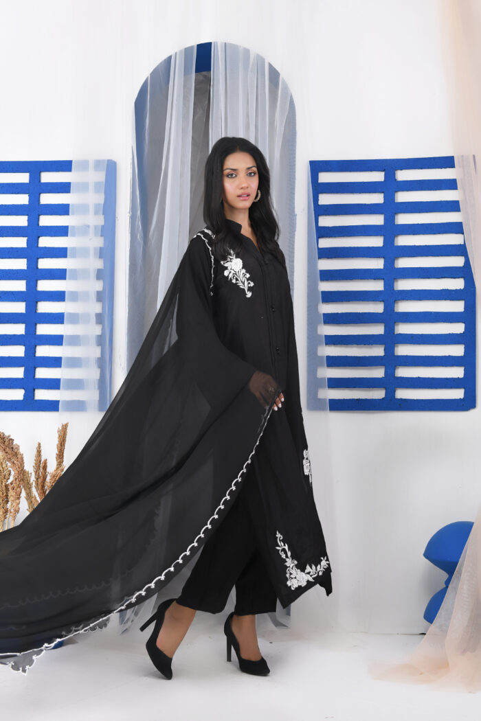 Festive Collection Vol 1 & 2An exquisitely ornamental silhouette GMS-710 in a unique hue of Black, is an Slightly A-line cut on raw silk fabric that features a intricately yet heavily detailed machine embroidered Bunches beautifully enhanced the beauty of this dress, shimmering black & white composition. Accompanied by a chiffon dupatta and straight pants along with the deliciated laces finish the design to perfection.