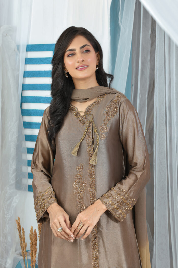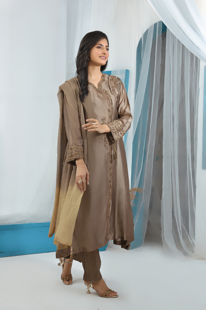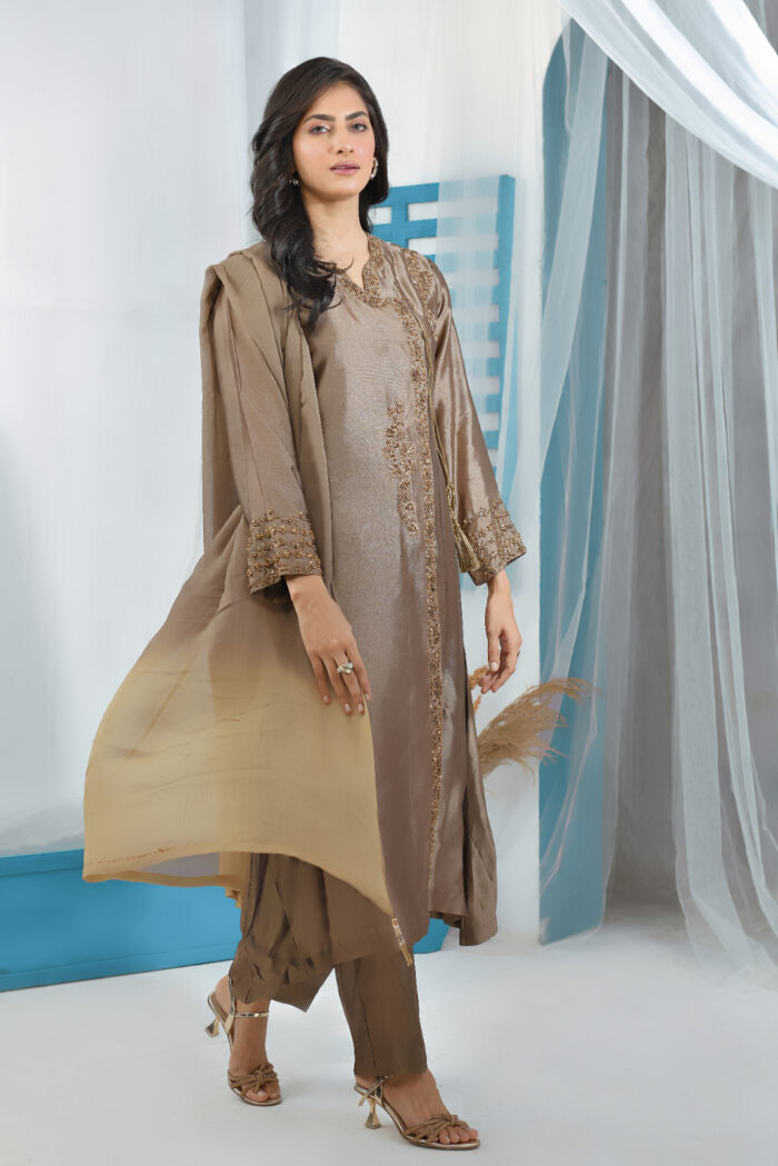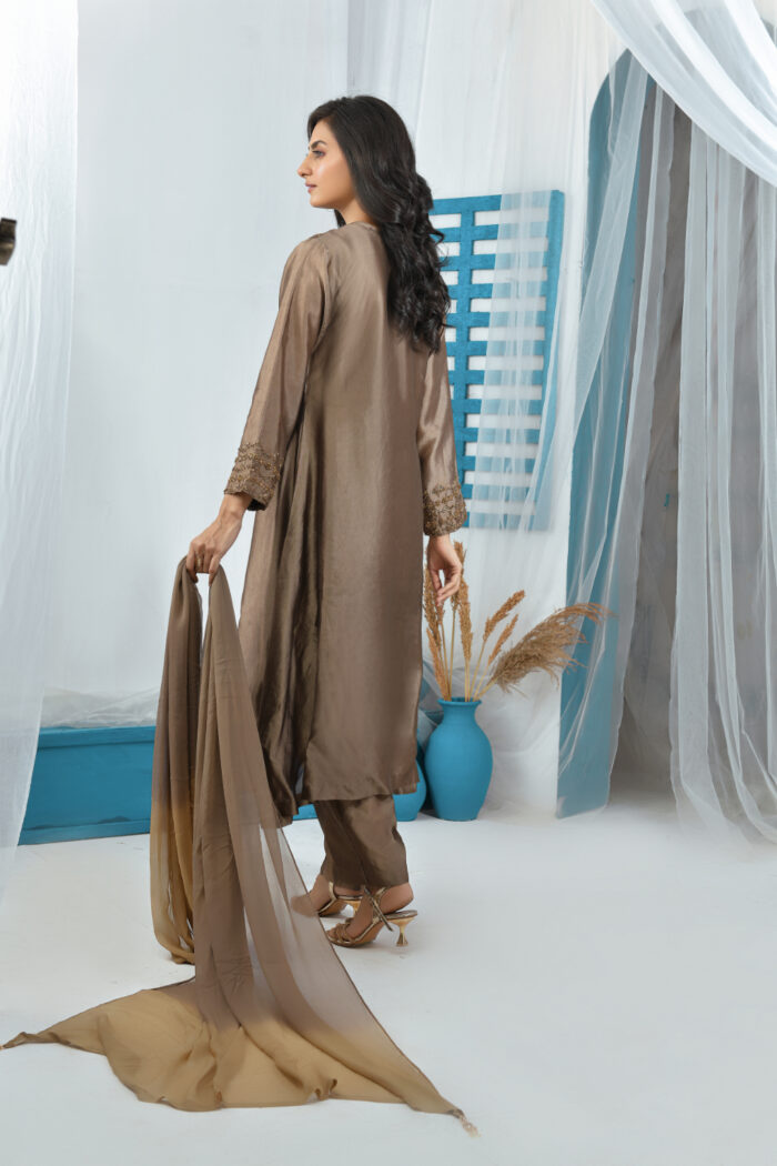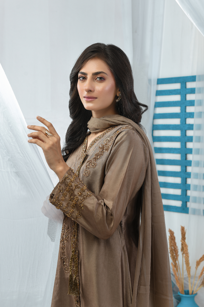 Luxury pretHazel Nut fabricated on pure Sheesh Silk. There is delicate hand embroidery on Shirt paired with pure Sheesh silk pants with double shaded chiffon Dupatta make it more traditional.