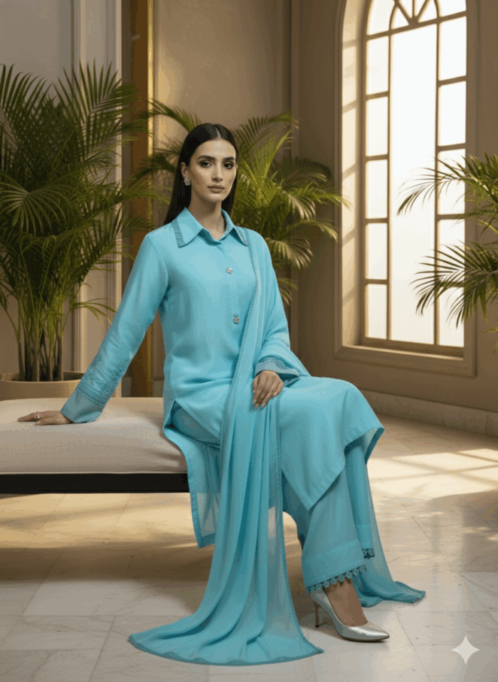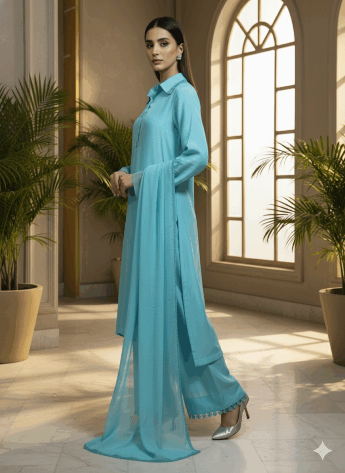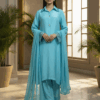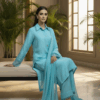 Festive Collection Vol 1 & 2The set is made from sweet touch raw silk . The light ferozi shade adds a subtle and classy touch to the outfit. The dress uses of quality laces in chalks & sleeves. The set comes with bell-bottom pants, adding a trendy and stylish element to the outfit.