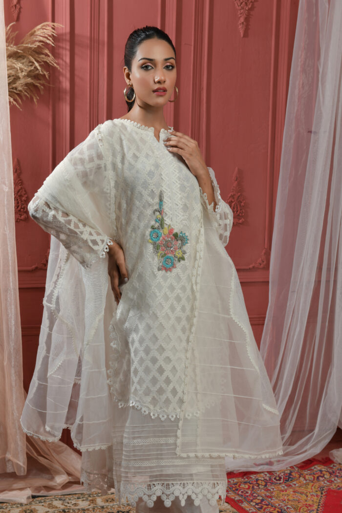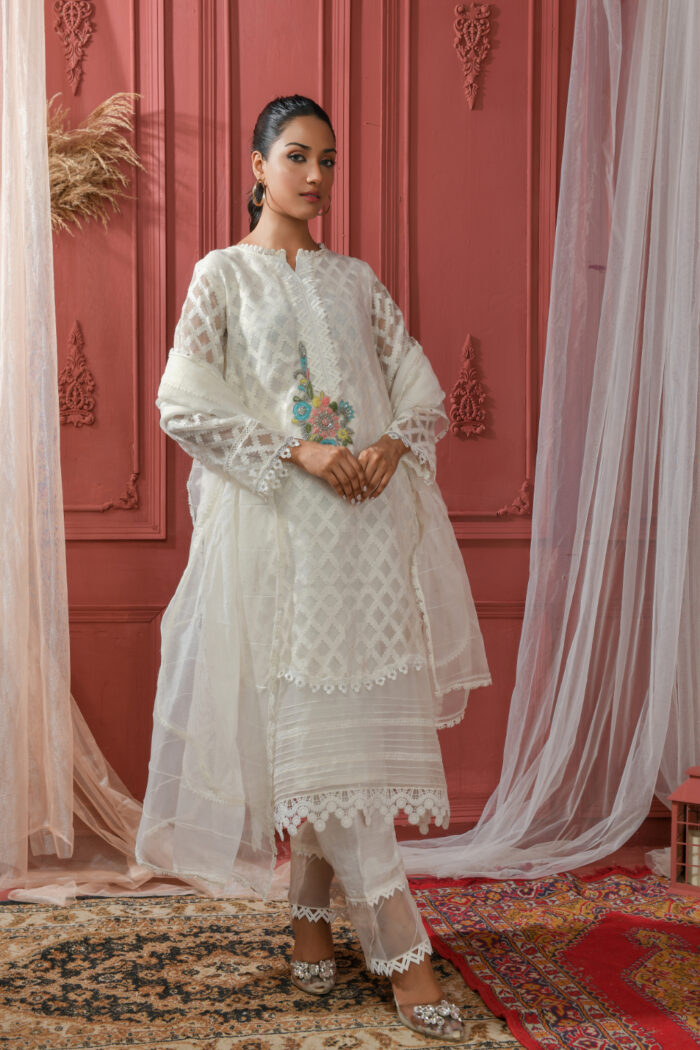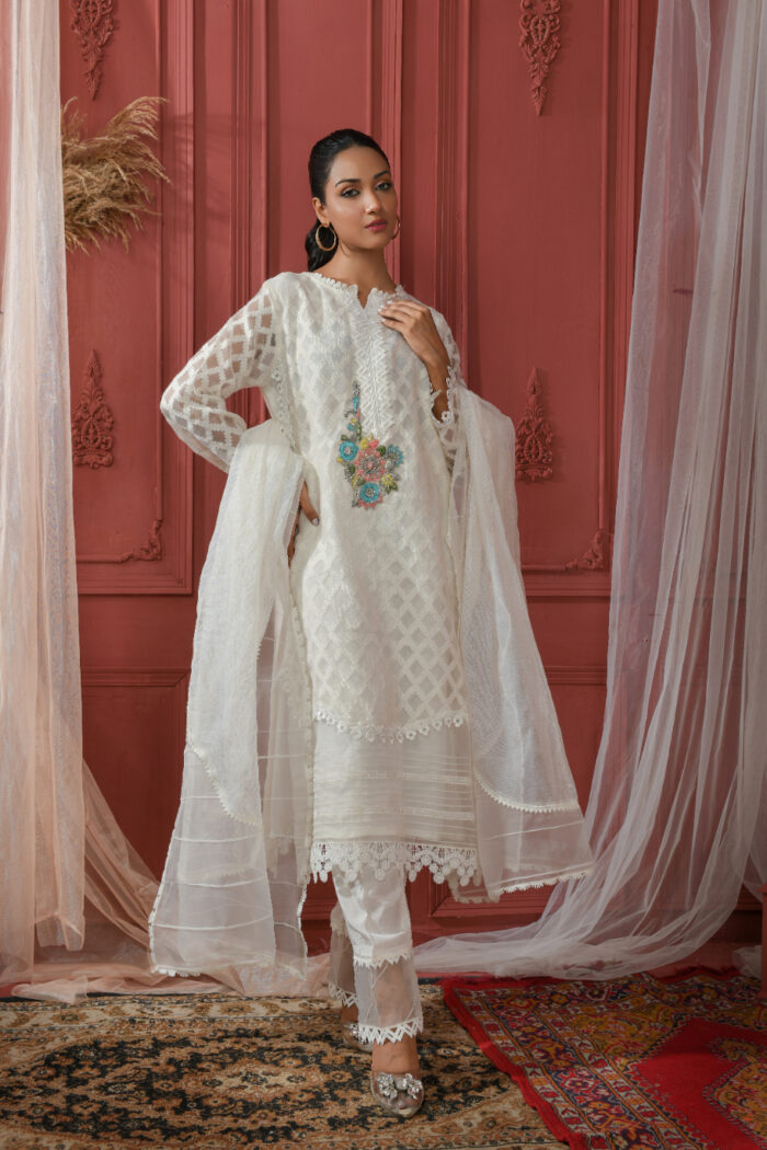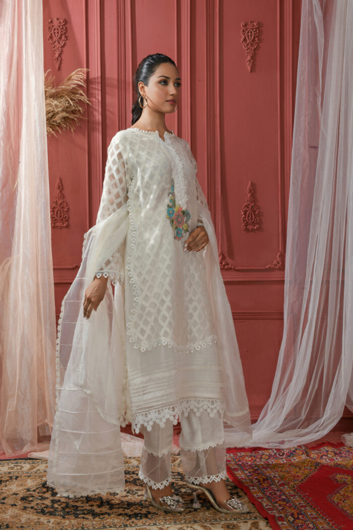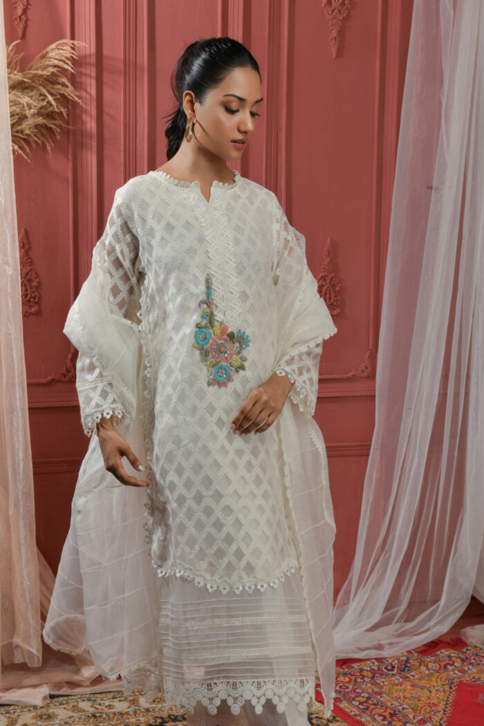 White colored dress fabricated on khadi net and embroidered organza.Delicate hand  embroidered motif on Shirt with different laces used on neckline damain and sleeves