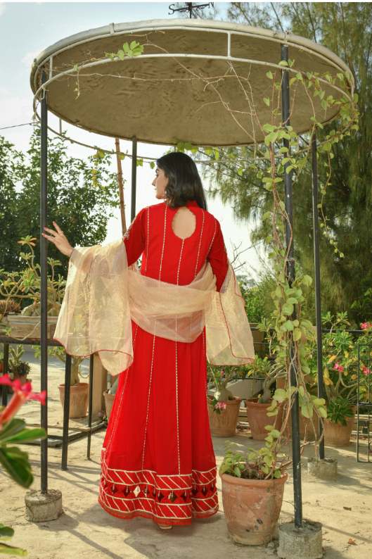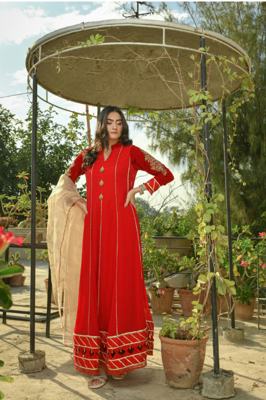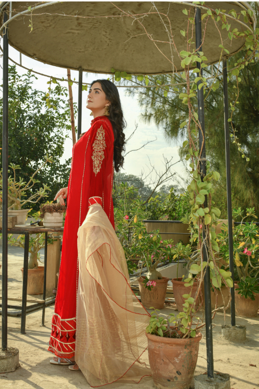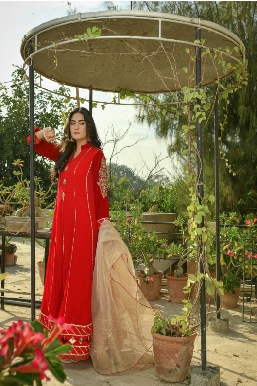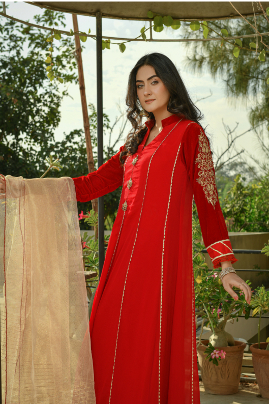 Wedding Dresses| It is a Reddish maroon chiffon and velvet long dress which has an intricate hand worked on velvet sleeves and on Chiffon Shirt neck have and fancy tassels.Nice detailing on shirt daman over all . It has a mixture of beautiful stitching and tussels on shirt. embroidered border all over.It is paired with pk raw silk straight pants and an khaadi maisoori contrast dupatta. |