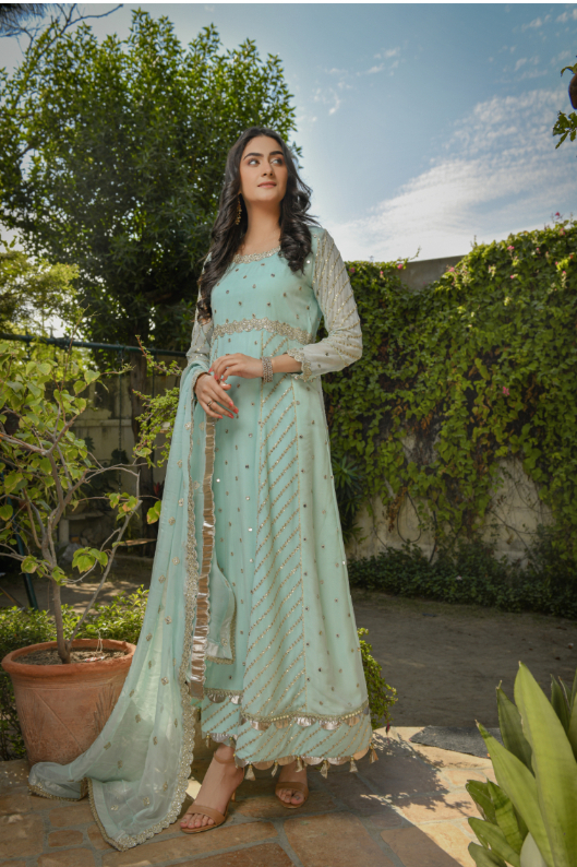 Luxury pret| This outfit is an intricately embellished masterpiece that steals everyone’s heart at the very first glance. This amazing outfit is laden with ornamentals Tussels making this dress an epitome of beauty. It achieves the final traditional appearance when paired with Rawsilk silk trouser and a delicate Computer Embroidered dupatta. Dupatta is adorned with Computer embroidered Borders of sitara and sequins. |