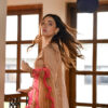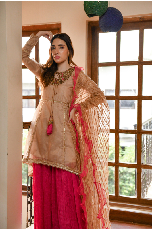Festive Collection Vol 1 & 2| It is a classic Peplum Style dress, it is beautiful hand embroidered Neckline with kora and dabka.It is pure with Shocking Pink Crushed Ijar and embriodered net Duppata. |