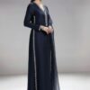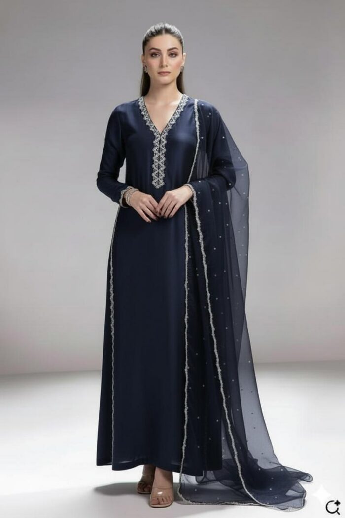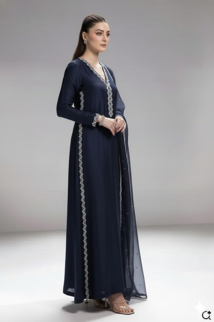 Luxury pretAn elegant sheesha silk dress paired with a delicate organza dupatta. The outfit features exquisite embroidered lace detailing along the neckline and side panels, adding a touch of sophistication. The soft organza dupatta is beautifully finished with a four-sided stone lace, giving it a graceful and timeless appeal.
