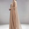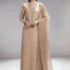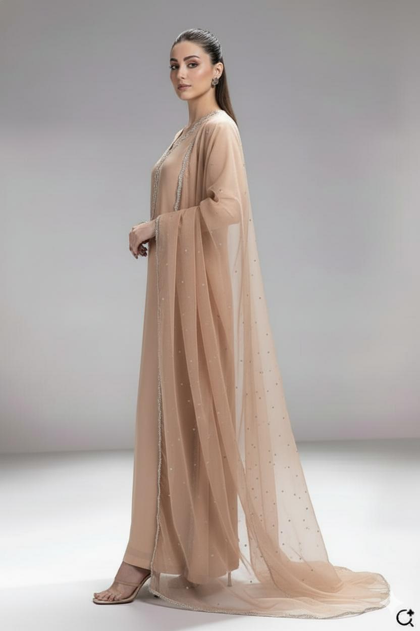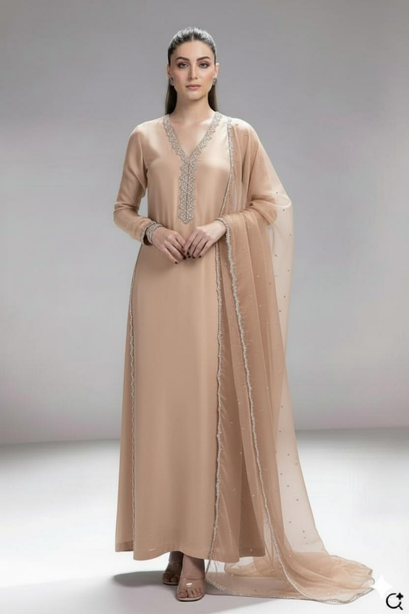 Luxury pretAn elegant sheesha silk dress paired with a delicate organza dupatta. The outfit features exquisite embroidered lace detailing along the neckline and side panels, adding a touch of sophistication. The soft organza dupatta is beautifully finished with a four-sided stone lace, giving it a graceful and timeless appeal.