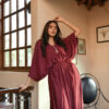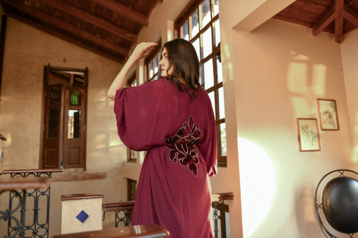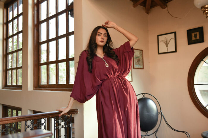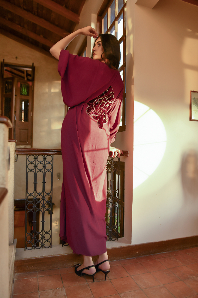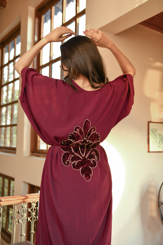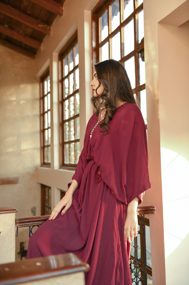 Festive Collection Vol 1 & 2Libas Exclusive New Festive Collection . This Burgundy Color Kaftan dress is made on Georgette having beautiful hand embroidery paired with Rawsilk bottom.This dress can be order in extra small , small, medium ,large , extra large or as make to measure.