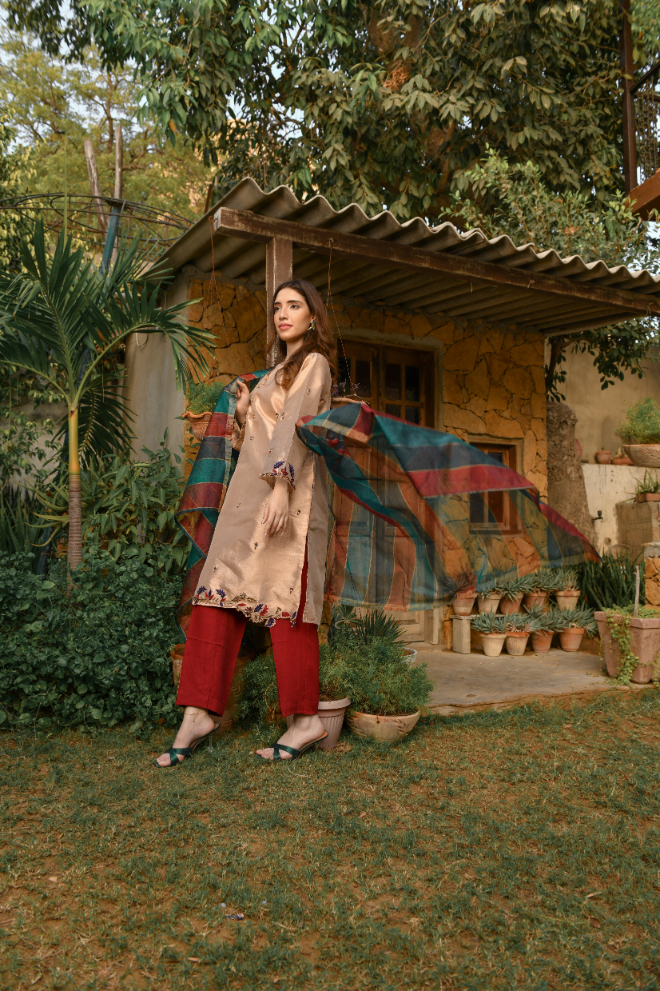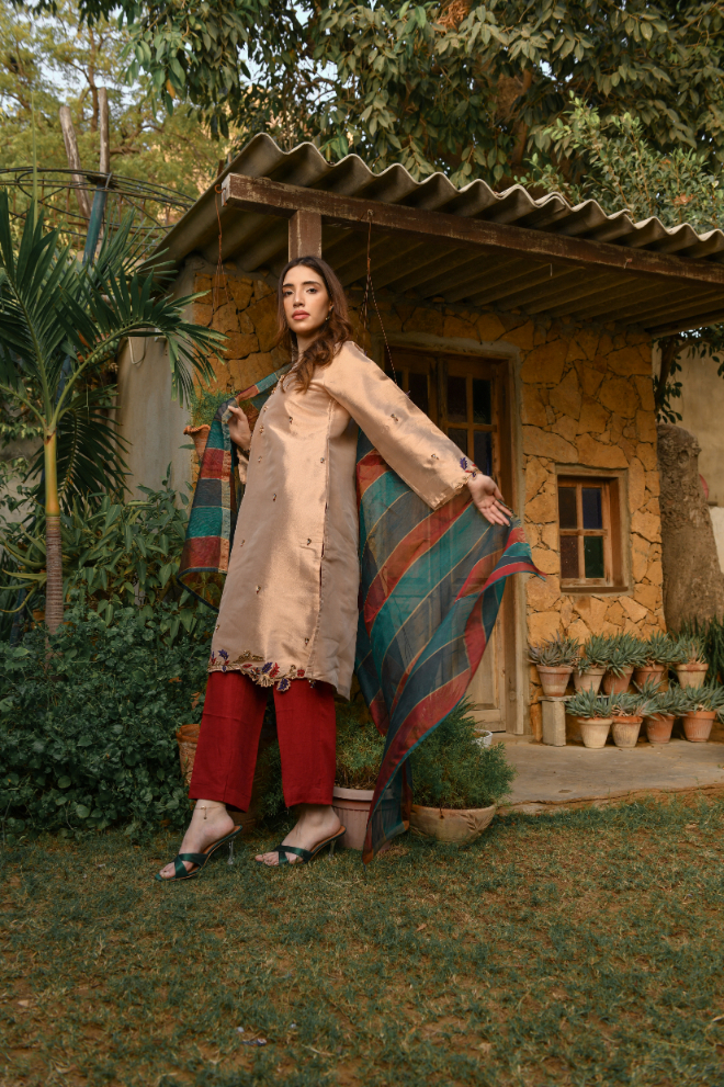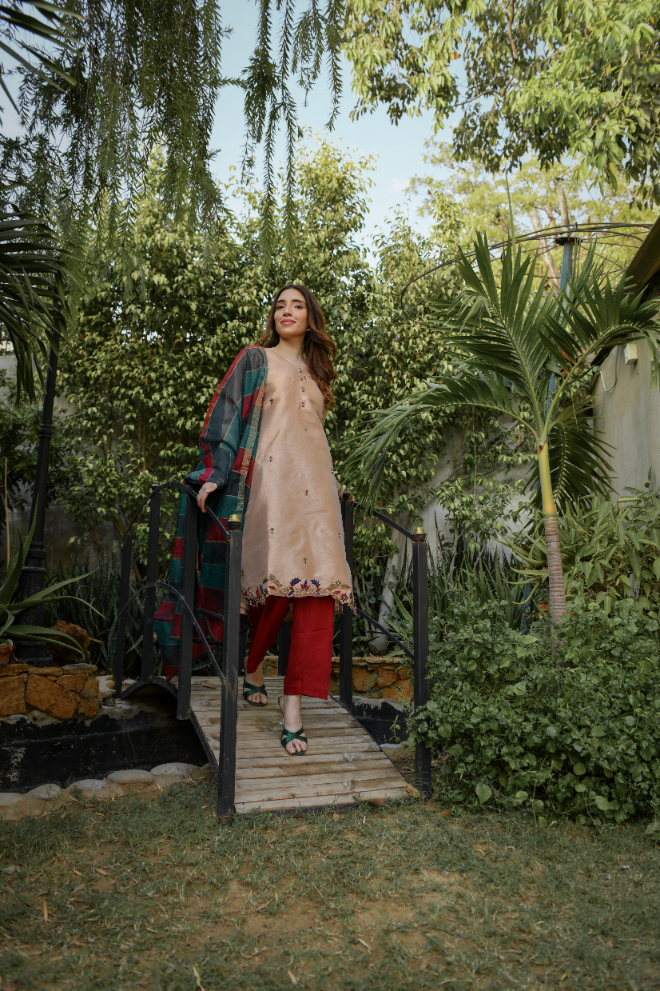 | SHIRT FABRIC: Maisoori TROUSER FABRIC: Raw Silk DUPATTA: Khaddi Net EMBROIDERY: Hand Embroidery |