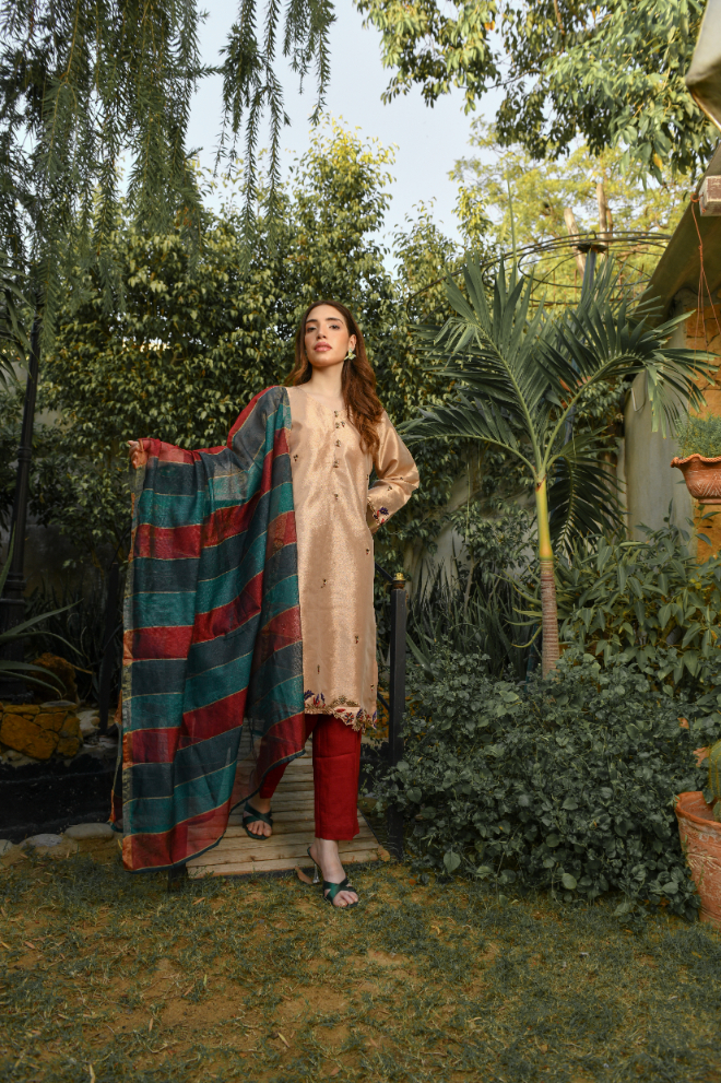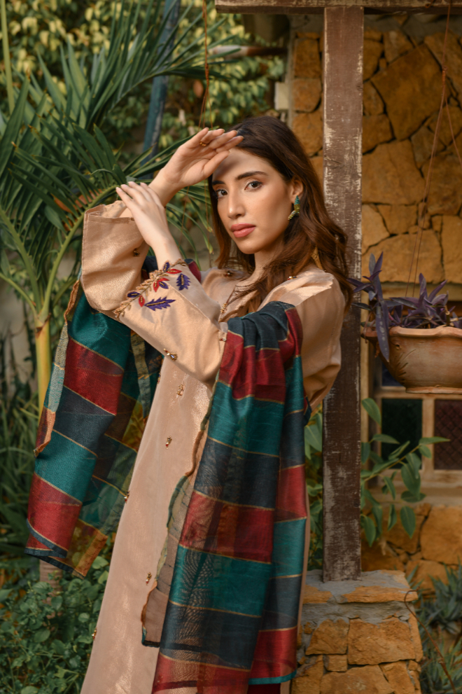 Festive Collection Vol 1 & 2Libas Exclusive New Festive Collection . This Cooper Color dress is made on Maisoori having beautiful hand embroidery paired with Khaadi net Contrast Duppata along with Rawsilk bottom.This dress can be order in extra small , small, medium ,large , extra large or as make to measure.
