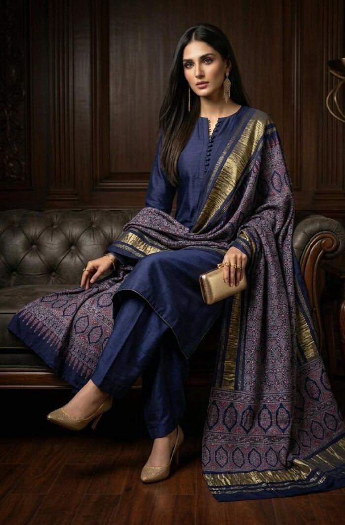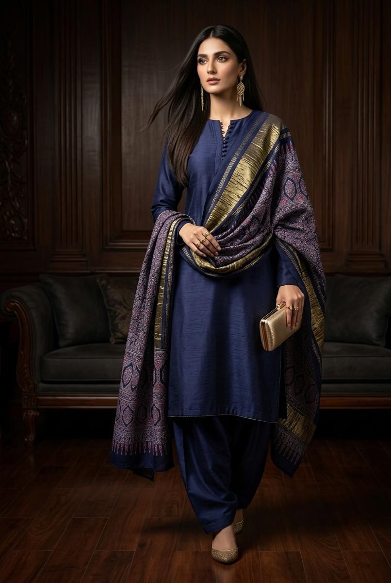SHEESHA SILK DRESS WITH AJRAK SHAWL ICS-1157