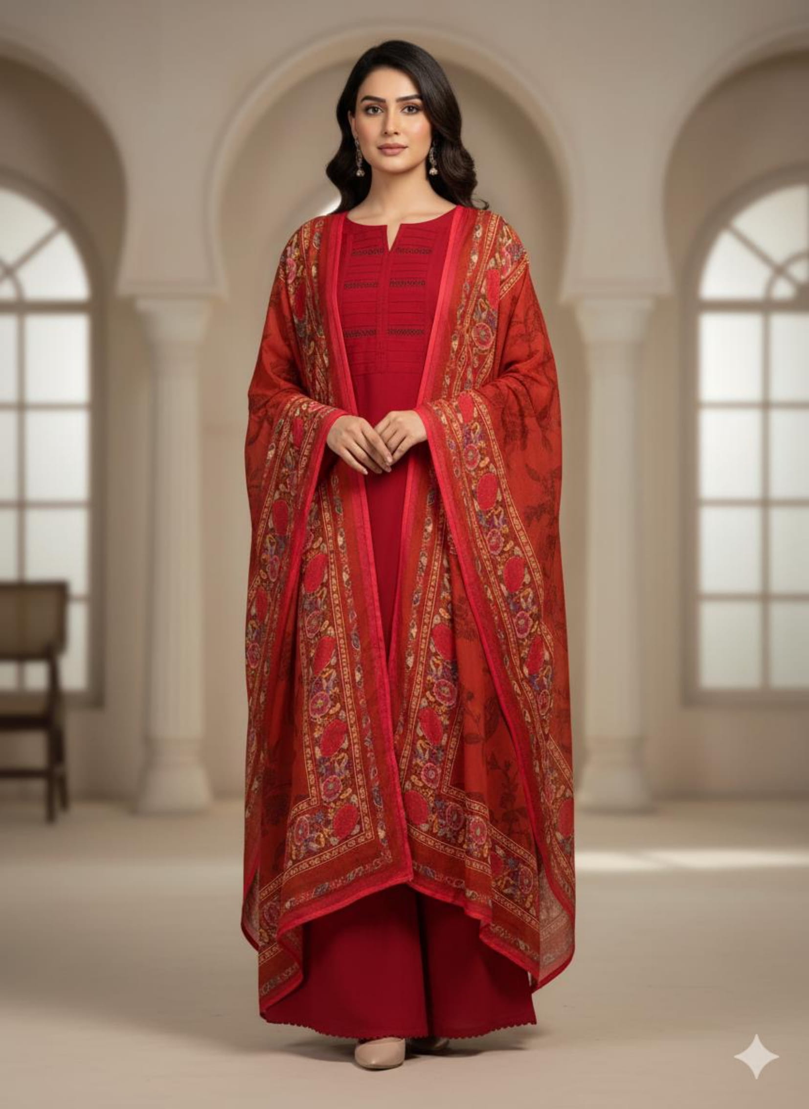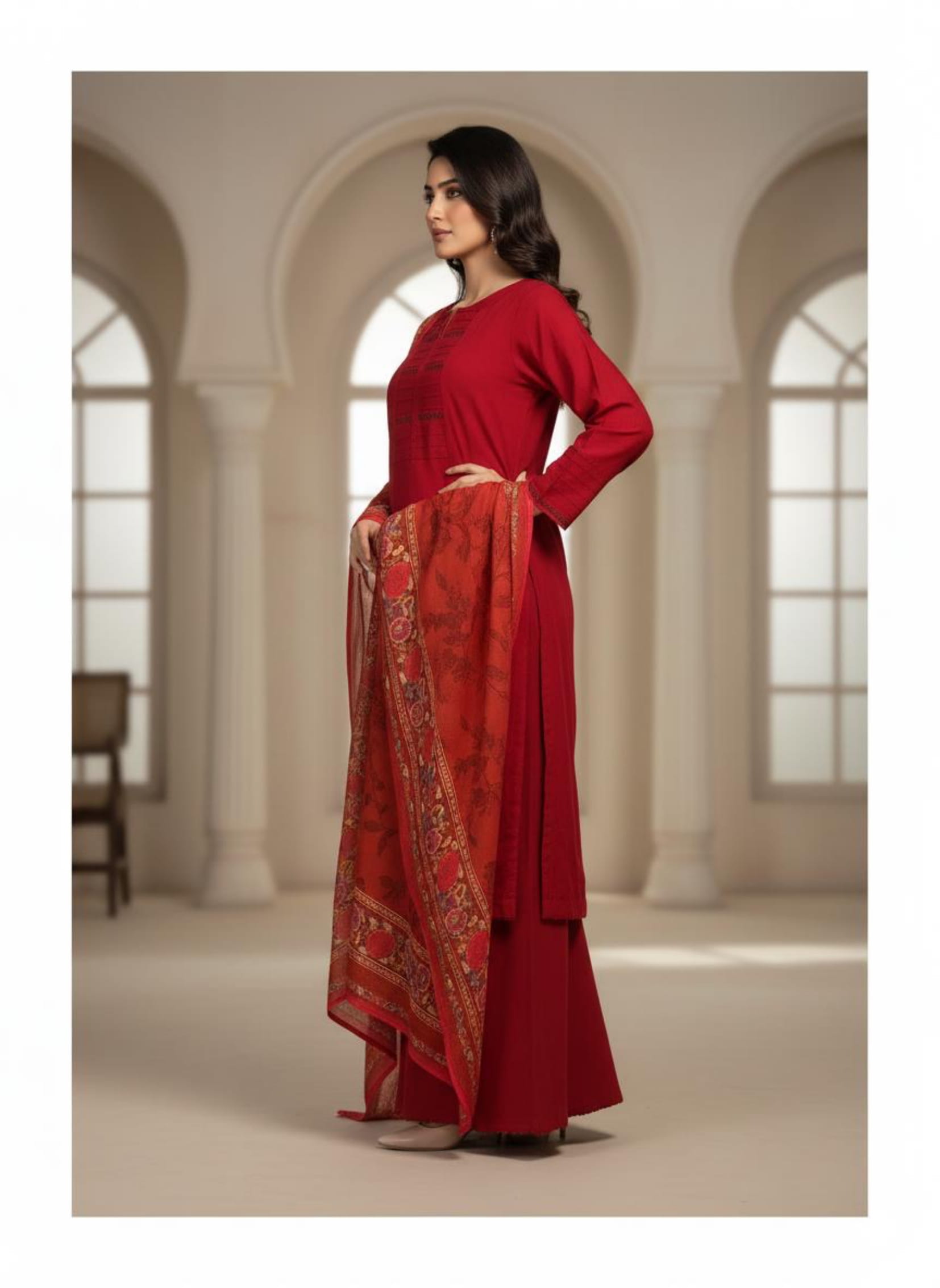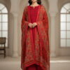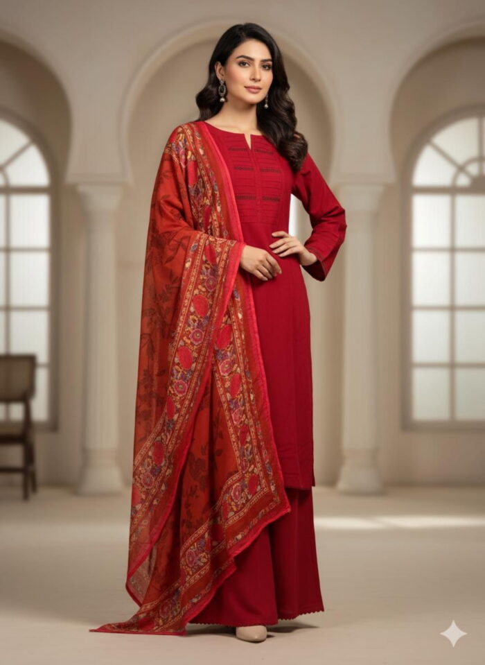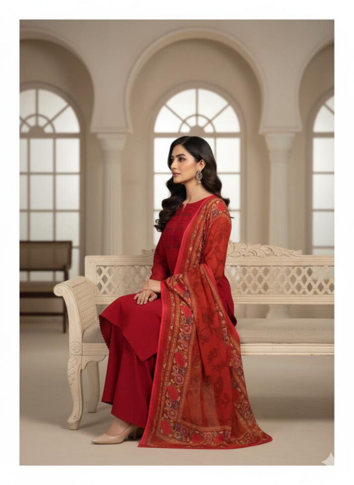 Festive Collection Vol 1 & 2A timeless winter look featuring a solid linen shirt paired with a matching plain linen bottom. The outfit is beautifully enhanced with lace detailing on sleeves and neckline, showcasing elegant stitching finesse. The look is completed with a khaadi dupatta adorned in rich floral patterns, adding a perfect blend of warmth and sophistication to your winter wardrobe.