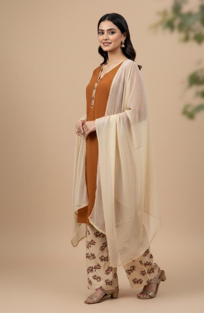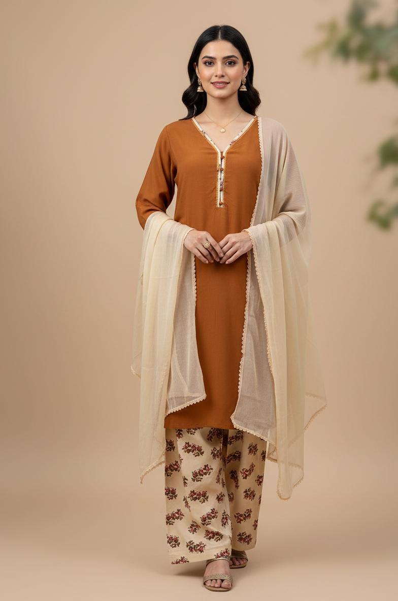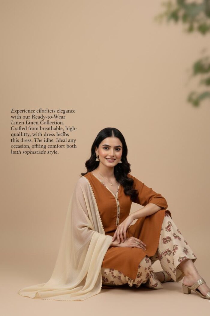 Festive Collection Vol 1 & 2A chic and timeless ensemble featuring a solid linen shirt in a vibrant tone, paired with a printed linen shalwar that adds a touch of floral elegance. The look is completed with a plain black chiffon dupatta, giving the outfit a graceful, flowy finish. Perfect for everyday wear, casual outings, or semi-formal gatherings, this outfit blends comfort with effortless style.