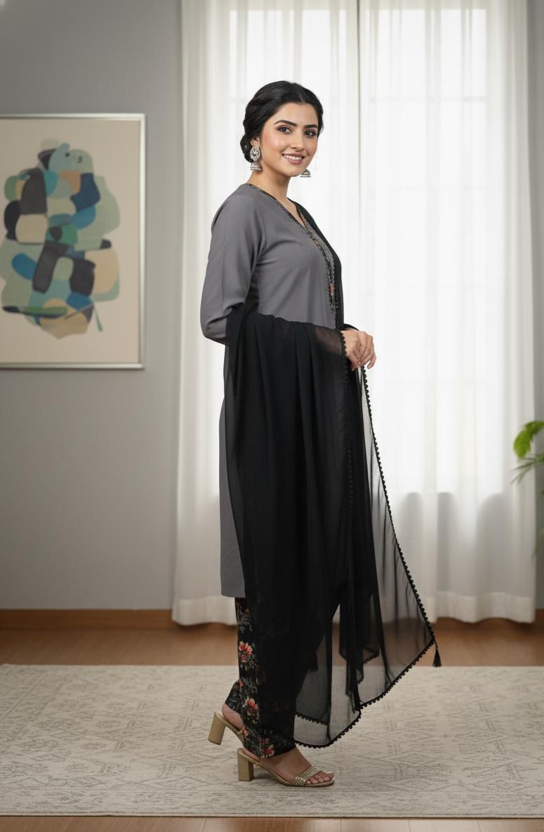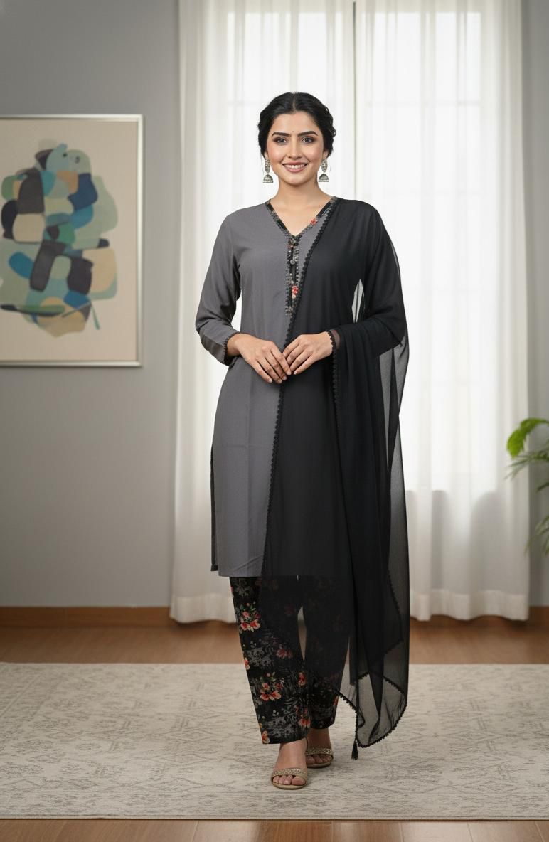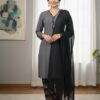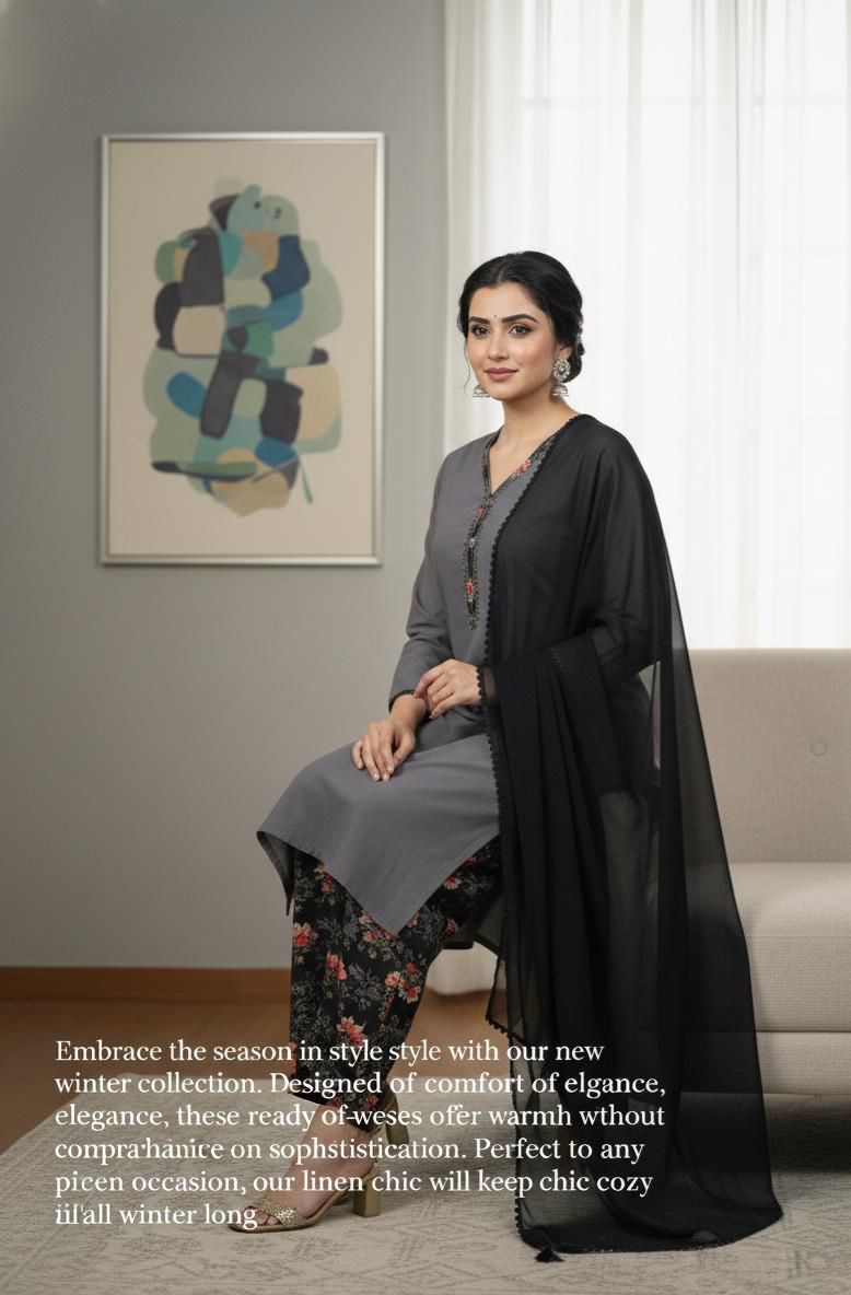 Festive Collection Vol 1 & 2A chic and timeless ensemble featuring a solid linen shirt in a vibrant tone, paired with a printed linen shalwar that adds a touch of floral elegance. The look is completed with a plain black chiffon dupatta, giving the outfit a graceful, flowy finish. Perfect for everyday wear, casual outings, or semi-formal gatherings, this outfit blends comfort with effortless style.