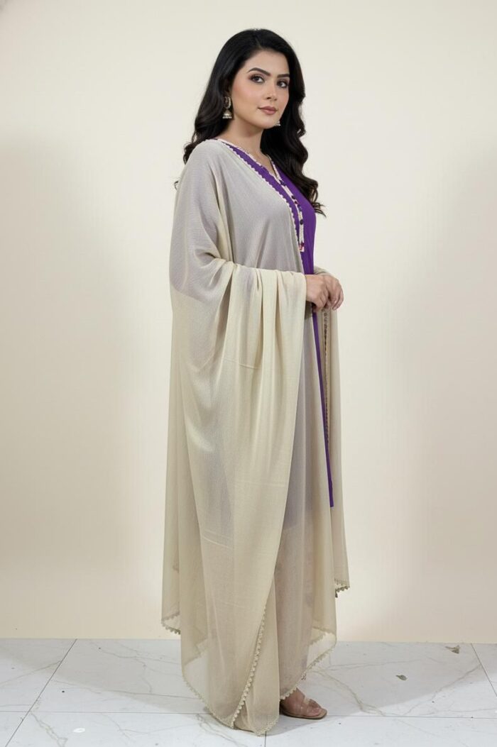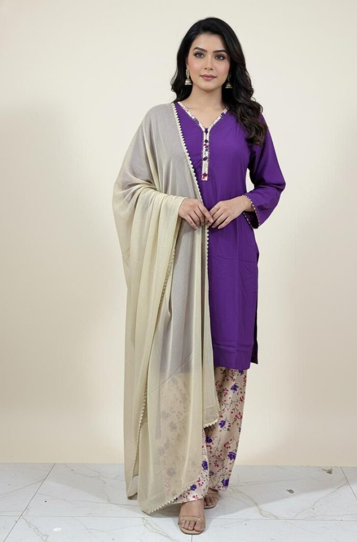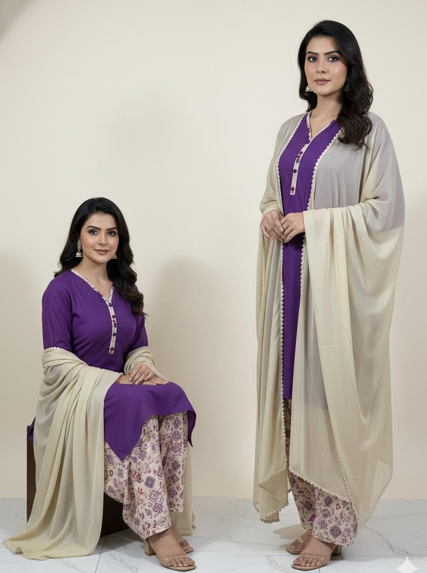 A chic and timeless ensemble featuring a solid linen shirt in a vibrant tone, paired with a printed linen shalwar that adds a touch of floral elegance. The look is completed with a plain black chiffon dupatta, giving the outfit a graceful, flowy finish. Perfect for everyday wear, casual outings, or semi-formal gatherings, this outfit blends comfort with effortless style.