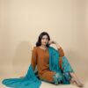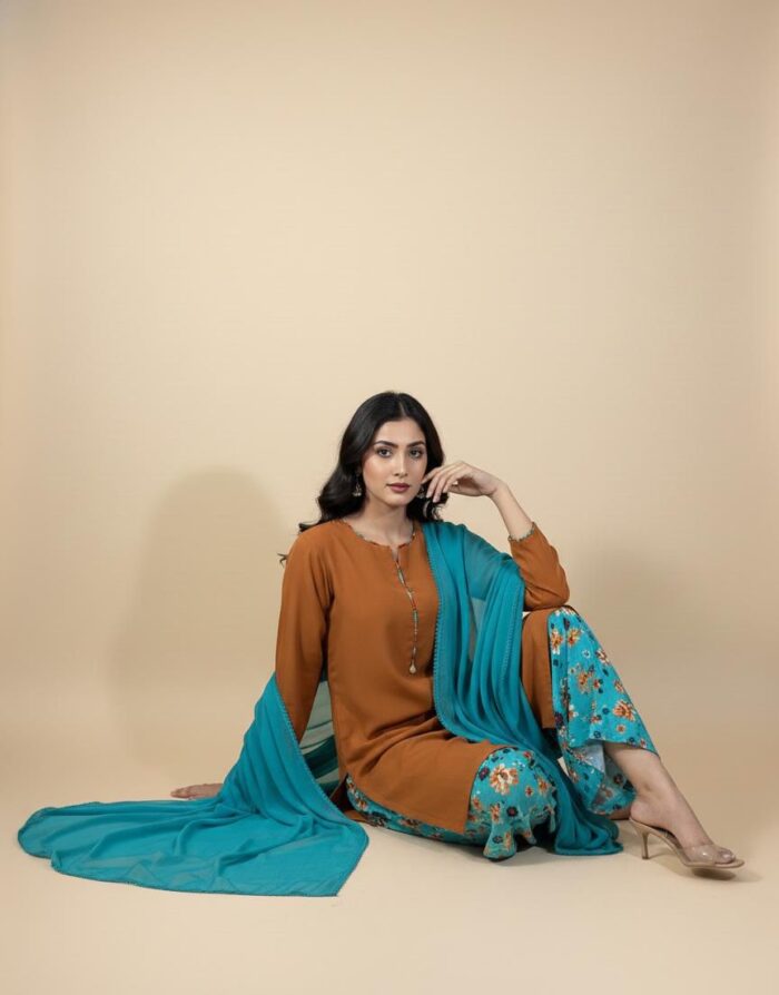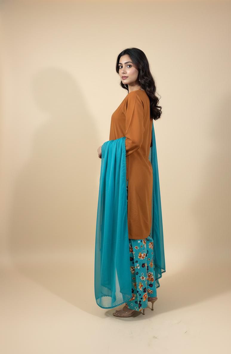 Festive Collection Vol 1 & 2A chic and timeless ensemble featuring a solid linen shirt in a vibrant tone, paired with a printed linen shalwar that adds a touch of floral elegance. The look is completed with a plain black chiffon dupatta, giving the outfit a graceful, flowy finish. Perfect for everyday wear, casual outings, or semi-formal gatherings, this outfit blends comfort with effortless style.