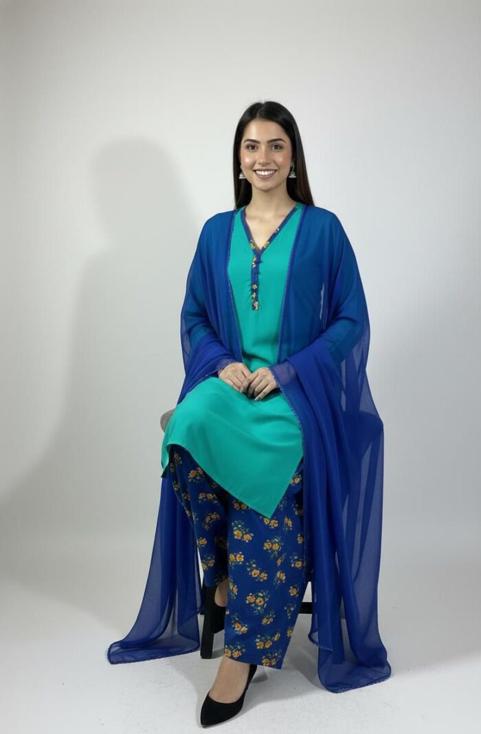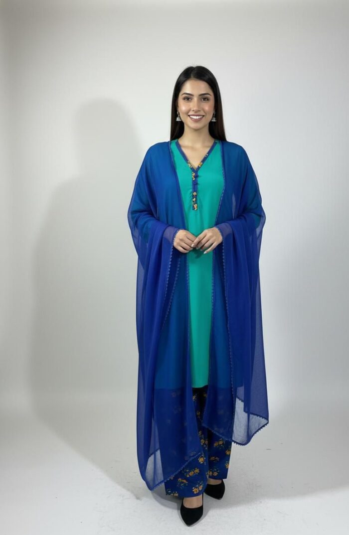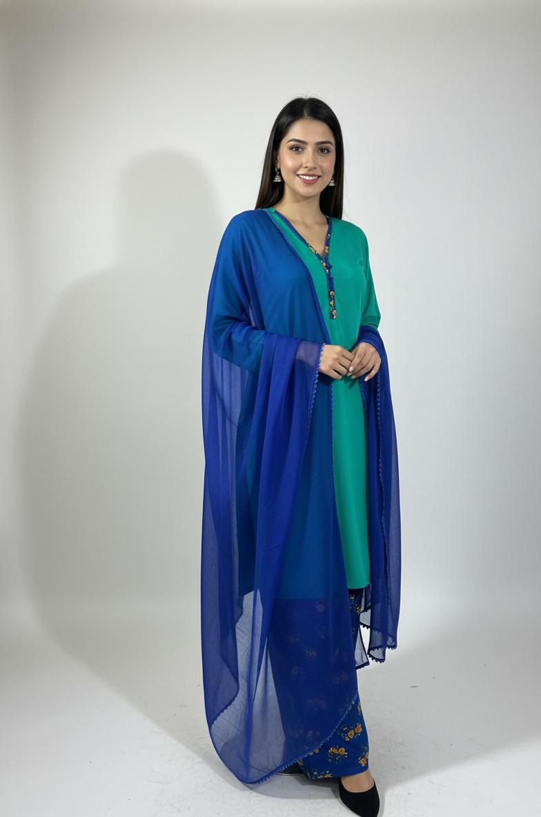 Festive Collection Vol 1 & 2A chic and timeless ensemble featuring a solid linen shirt in a vibrant tone, paired with a printed linen shalwar that adds a touch of floral elegance. The look is completed with a plain black chiffon dupatta, giving the outfit a graceful, flowy finish. Perfect for everyday wear, casual outings, or semi-formal gatherings, this outfit blends comfort with effortless style.