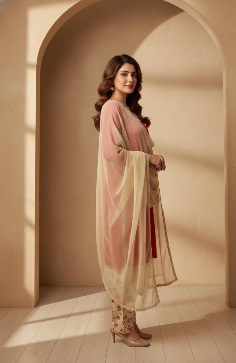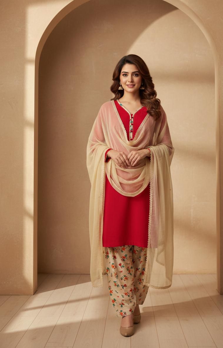 Festive Collection Vol 1 & 2A chic and timeless ensemble featuring a solid linen shirt in a vibrant tone, paired with a printed linen shalwar that adds a touch of floral elegance. The look is completed with a plain black chiffon dupatta, giving the outfit a graceful, flowy finish. Perfect for everyday wear, casual outings, or semi-formal gatherings, this outfit blends comfort with effortless style.