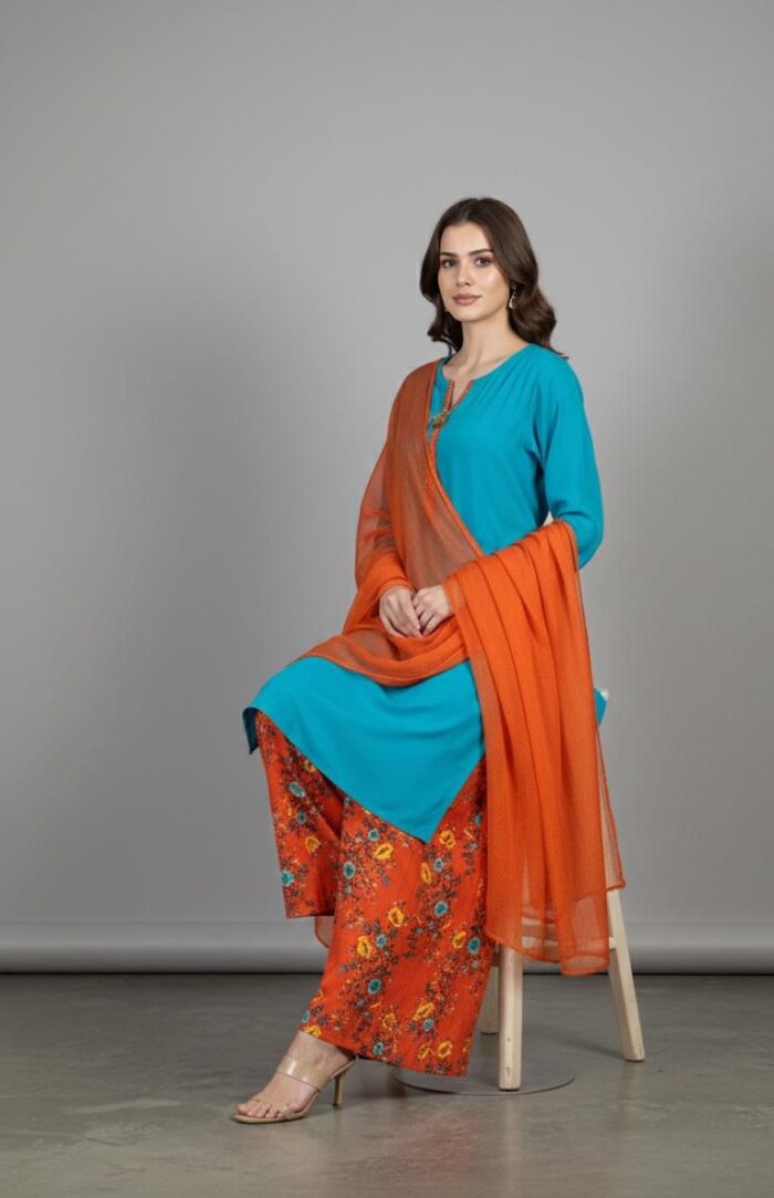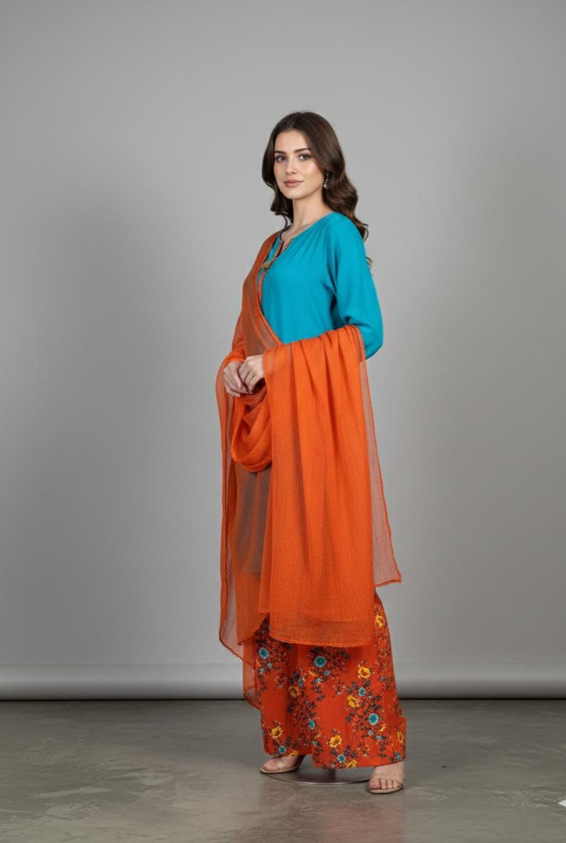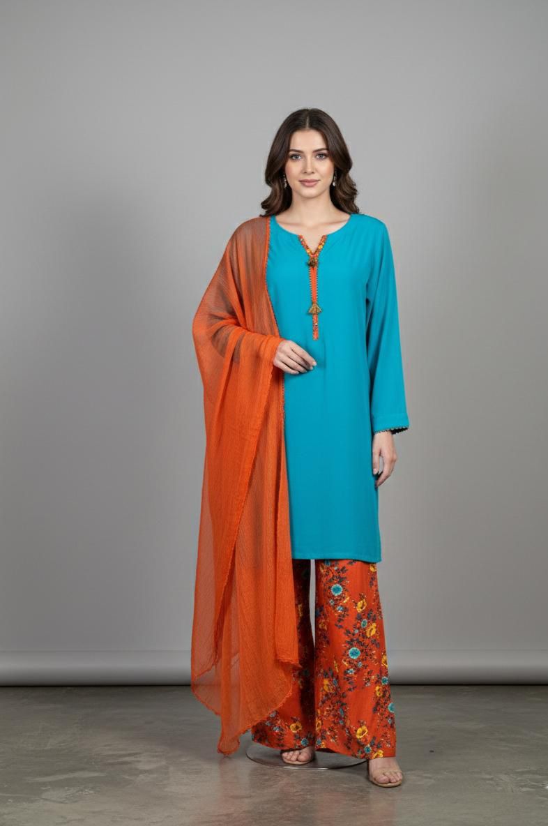 Festive Collection Vol 1 & 2A chic and timeless ensemble featuring a solid linen shirt in a vibrant tone, paired with a printed linen shalwar that adds a touch of floral elegance. The look is completed with a plain black chiffon dupatta, giving the outfit a graceful, flowy finish. Perfect for everyday wear, casual outings, or semi-formal gatherings, this outfit blends comfort with effortless style.