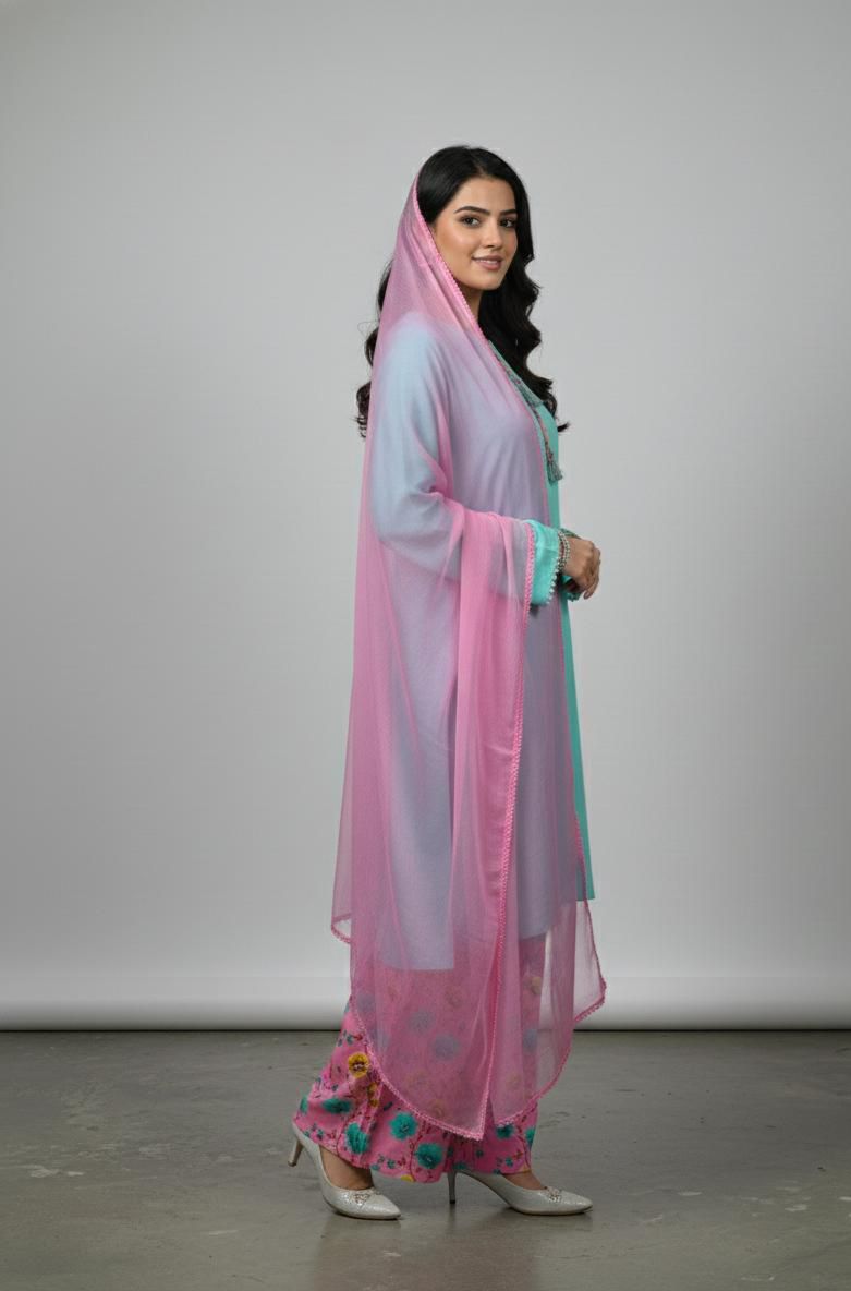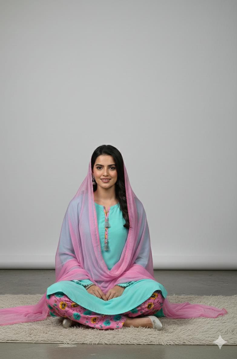 Festive Collection Vol 1 & 2A chic and timeless ensemble featuring a solid linen shirt in a vibrant tone, paired with a printed linen shalwar that adds a touch of floral elegance. The look is completed with a plain black chiffon dupatta, giving the outfit a graceful, flowy finish. Perfect for everyday wear, casual outings, or semi-formal gatherings, this outfit blends comfort with effortless style.