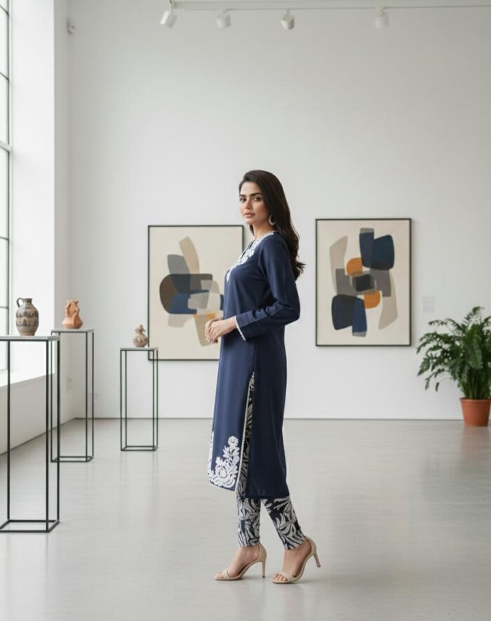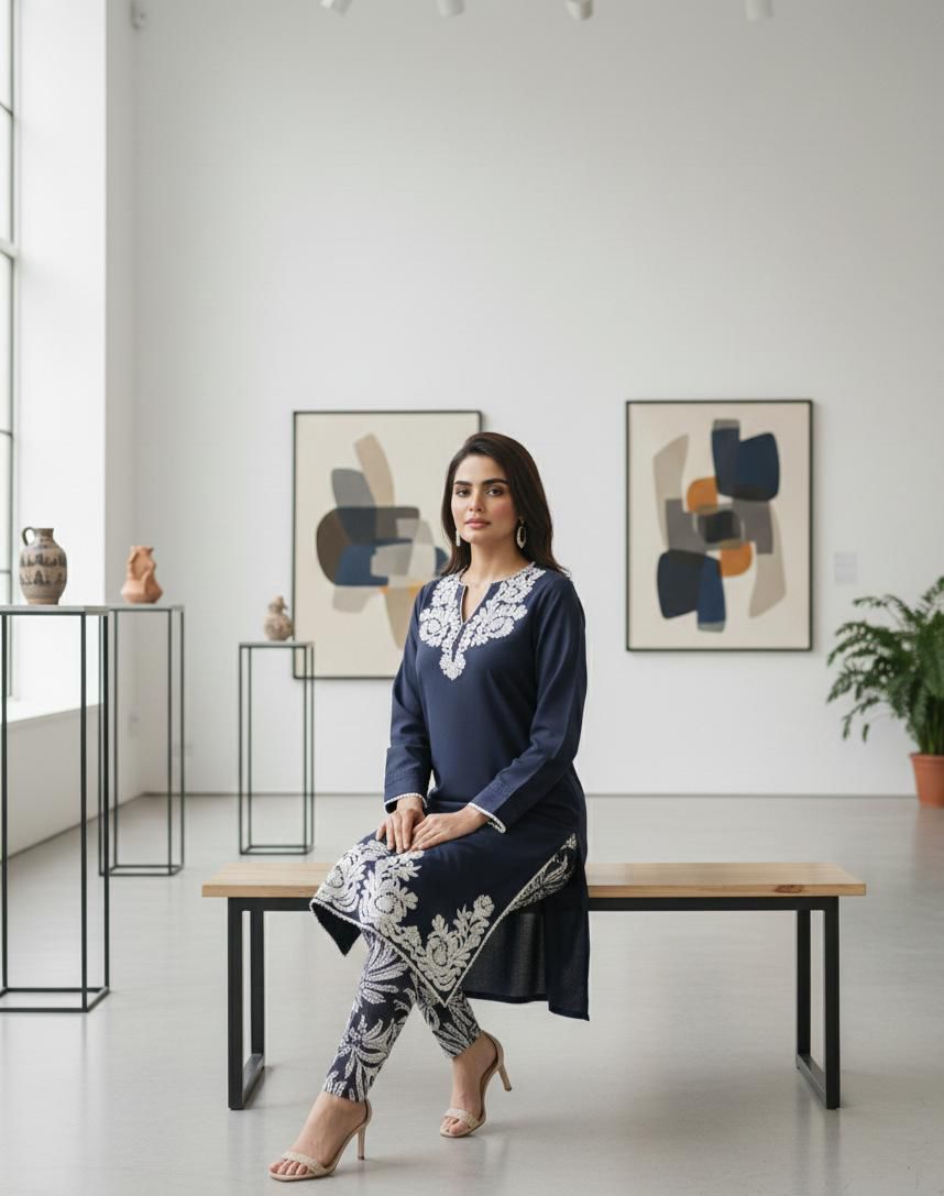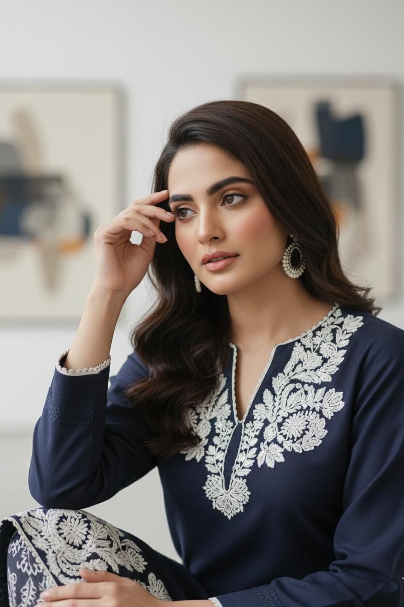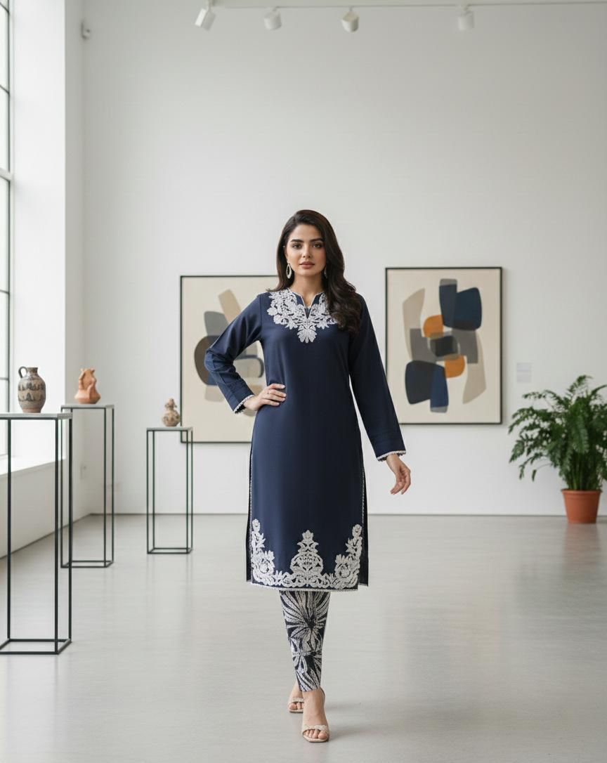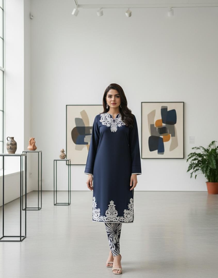 Co-rd SetsElevate your winter wardrobe with this elegant Marina solid shirt, beautifully adorned with a delicate embroidered neckline and intricately crafted daman detailing. Paired with coordinated printed Marina pants, this outfit blends comfort with refined sophistication. Perfect for both casual and semi-formal occasions, offering a graceful yet modern look.