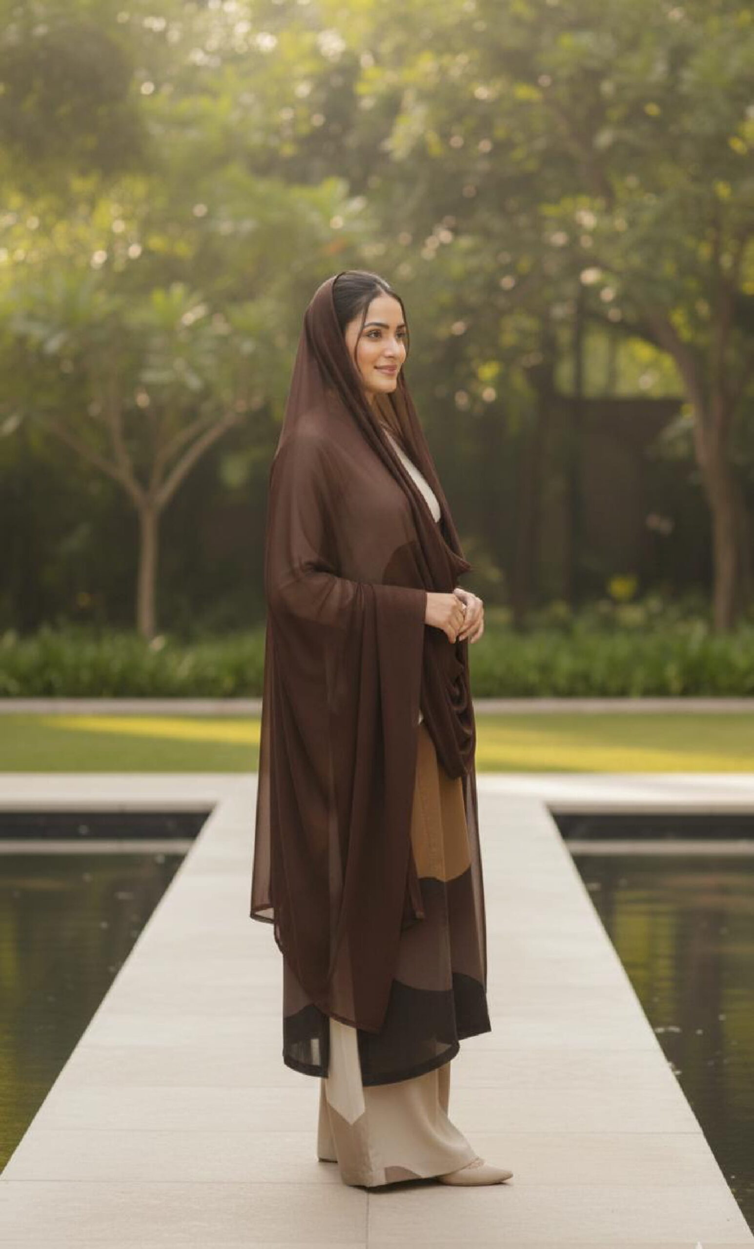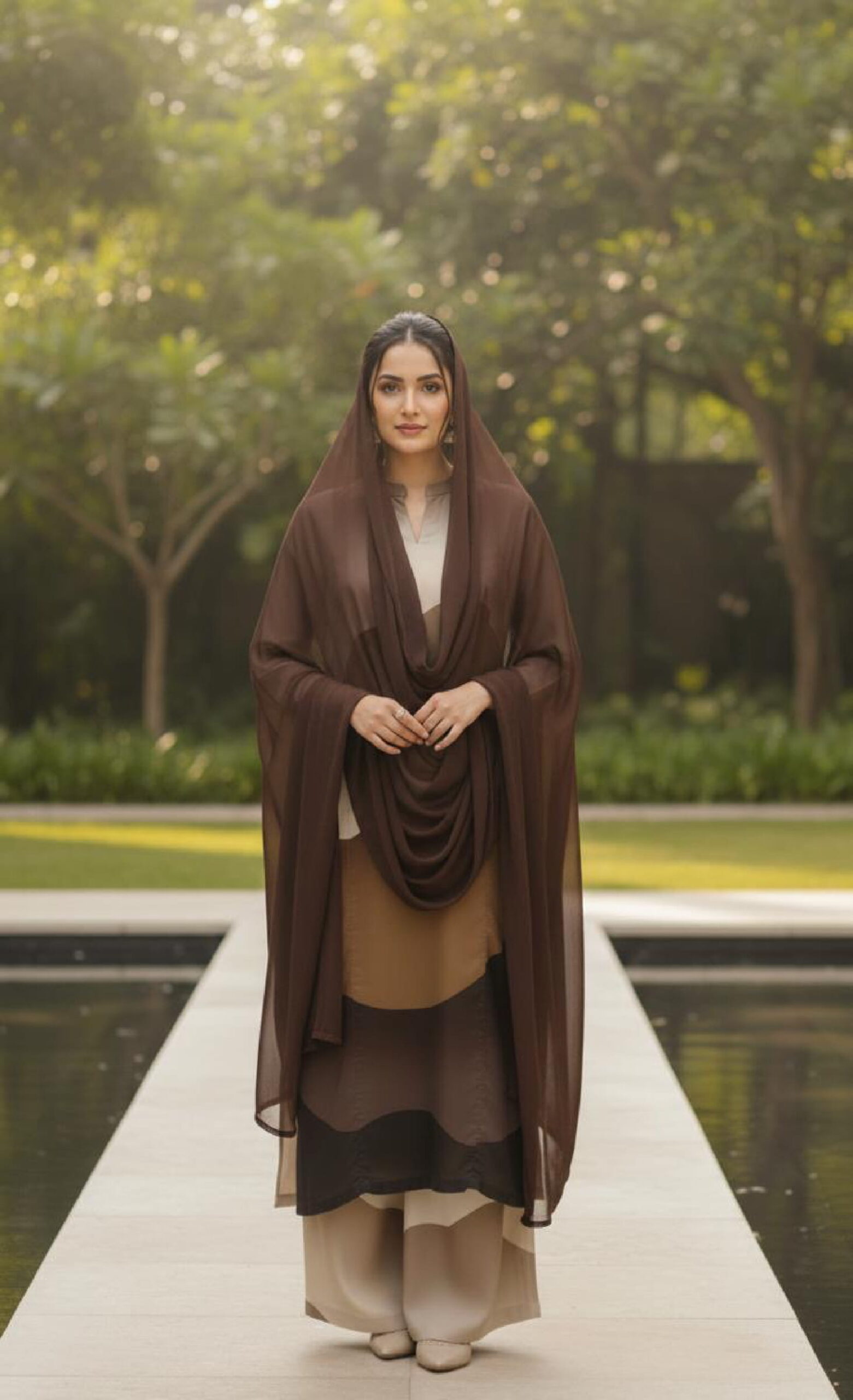 The ensemble is completed with a flowy chiffon dupatta, adding an airy, feminine touch that enhances the overall charm of the outfit. Perfect for semi-formal gatherings, evening wear, or festive occasions.