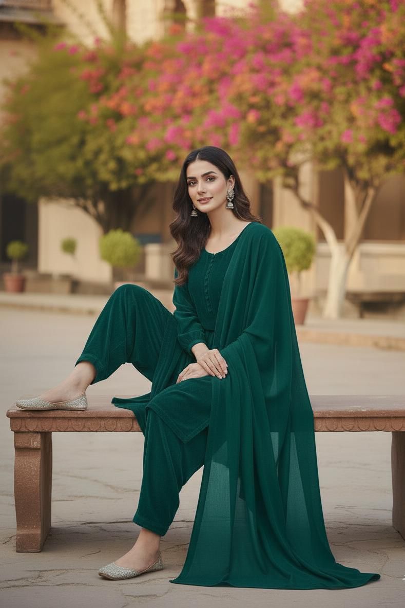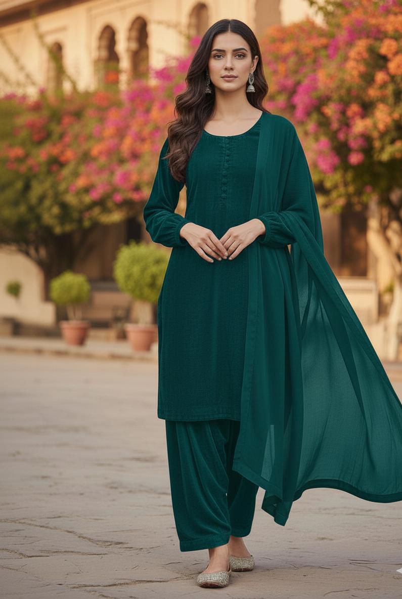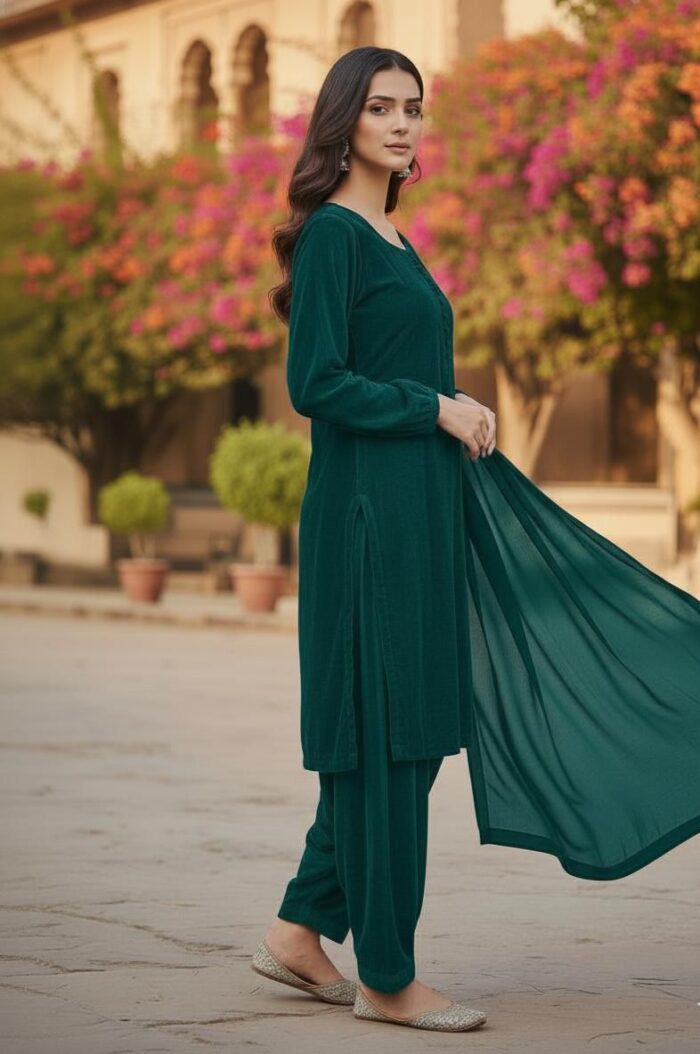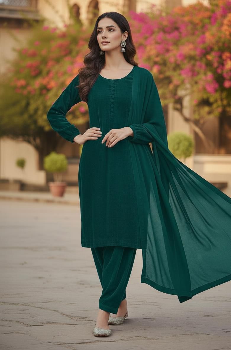 Luxury pretGrace meets sophistication in this stunning black velvet outfit — paired with a beautifully stitched velvet shalwar and a flowy chiffon dupatta. The soft texture and graceful drape make it a timeless choice for winter gatherings and evening occasions.
