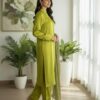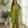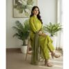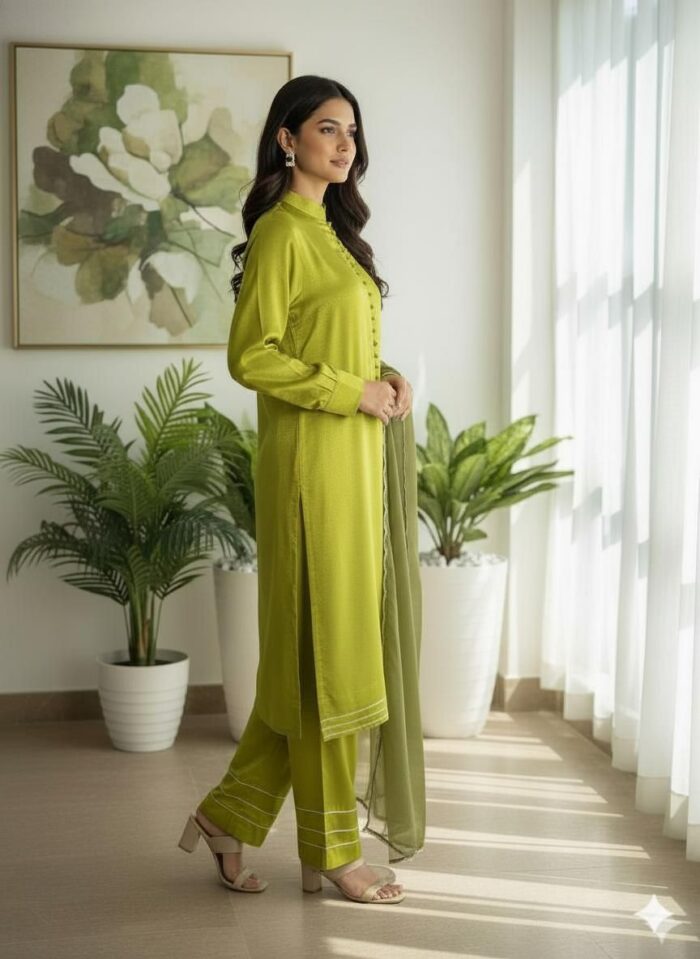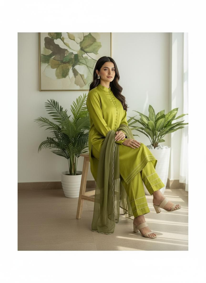 Festive Collection Vol 1 & 2Exude timeless elegance with this stunning ensemble crafted on velvet silk fabric, featuring a sleek long shirt paired with matching trousers. The outfit is complemented by a soft chiffon dupatta with delicately finished edges, adding a graceful flow to the look. Perfect for festive gatherings or semi-formal occasions, this design blends sophistication with modern minimalism.